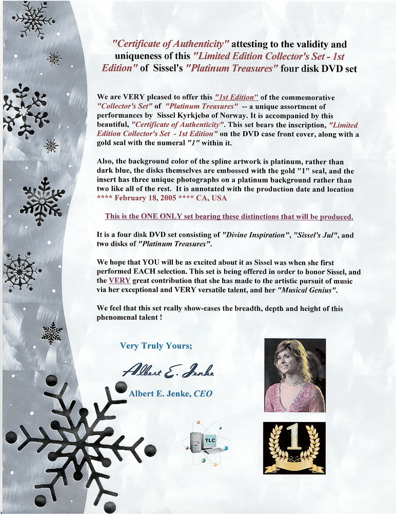 In the first frame, you may view the opening screen plus five additional title selection screens from the DVD itself. The following three frames show the front and back covers of the DVD case, the "Certificate of Authenticity", the four DVD disks and the insert consisting of three "personalized photographs" of Sissel. If you click on this link [ HERE ], you may also view the additional enclosed information. It consists of a breakdown of all of the included songs. This 4-DVD set is comprised of over seven hours of magical, musical beauty brought to you by our heavenly, velvet-voiced song-bird from Norway. |