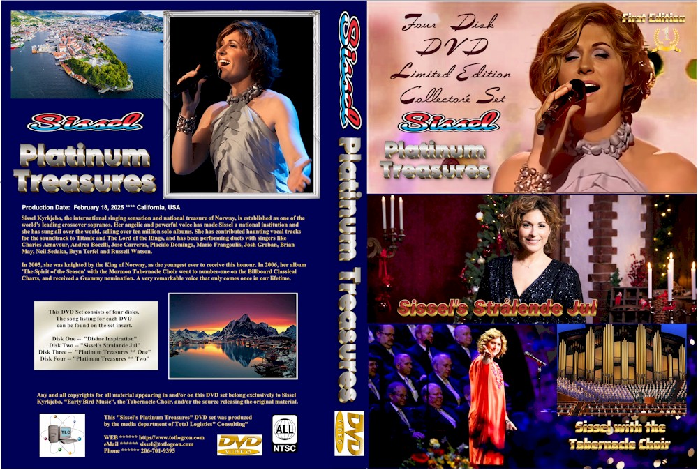 This set is being offered in order to honor Sissel, and the VERY great contribution that she has made to the artistic pursuit of music via her exceptional and versatile talent, and her "Musical Genius". WE do not believe that it would be ANY exaggeration to state that - from the inception of her professional career at age 16 up to present day - no one has ever displayed a greater breadth, depth, height and versatility of musical talent than has Sissel. In this collection, the videos are EACH Artistic Masterpieces. We feel that it really show-cases this phenomenal talent ! Considering the "Total Sissel" --- Beauty, Charisma, Charm, Spiritual depth, overall Talent, Versatility, and Voice - we believe that she is a "one-of-a-kind" creation of God. She is a magnificent, once-in-an-age synergy of Heavenly Beauty of Person and Voice - the likes of which mankind will not be graced to see again soon !! Therefore, we offer a MOST Special Tribute to a MOST Special Woman. The song above - "Wind Beneath My Wings" - says ALL that we, your fans, can express to you - YOU are our HERO!! Looking at the "Worldwide Music Industry" - and ESPECIALLY in the United States - others had all the Glory - while you were (and are) content to remain in the shadows. A large part of your great strength was and is your humility and modesty -- "I never once heard you complain". It is enough that YOU know that you are a STAR!! Yet YOU are, always were, and will continue to be - the brightest, most glorious and highest STAR of all in the musical firmament !! Therefore, this set is being offered for the production and distribution costs of the DVD set itself - plus any shipping, local taxes, and various duty charges such as each country may require. NO profit is being realized from this sale. All of the development, distribution, and production labor was/is being donated on behalf of Sissel. |